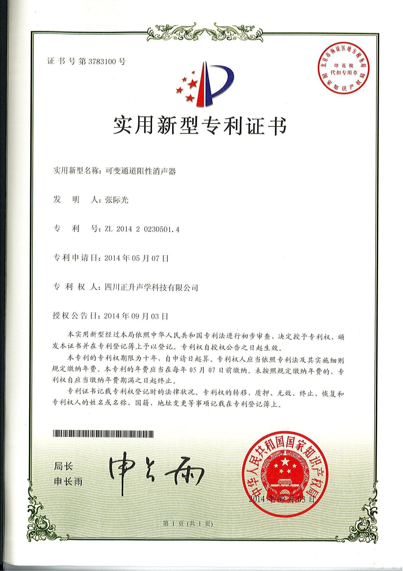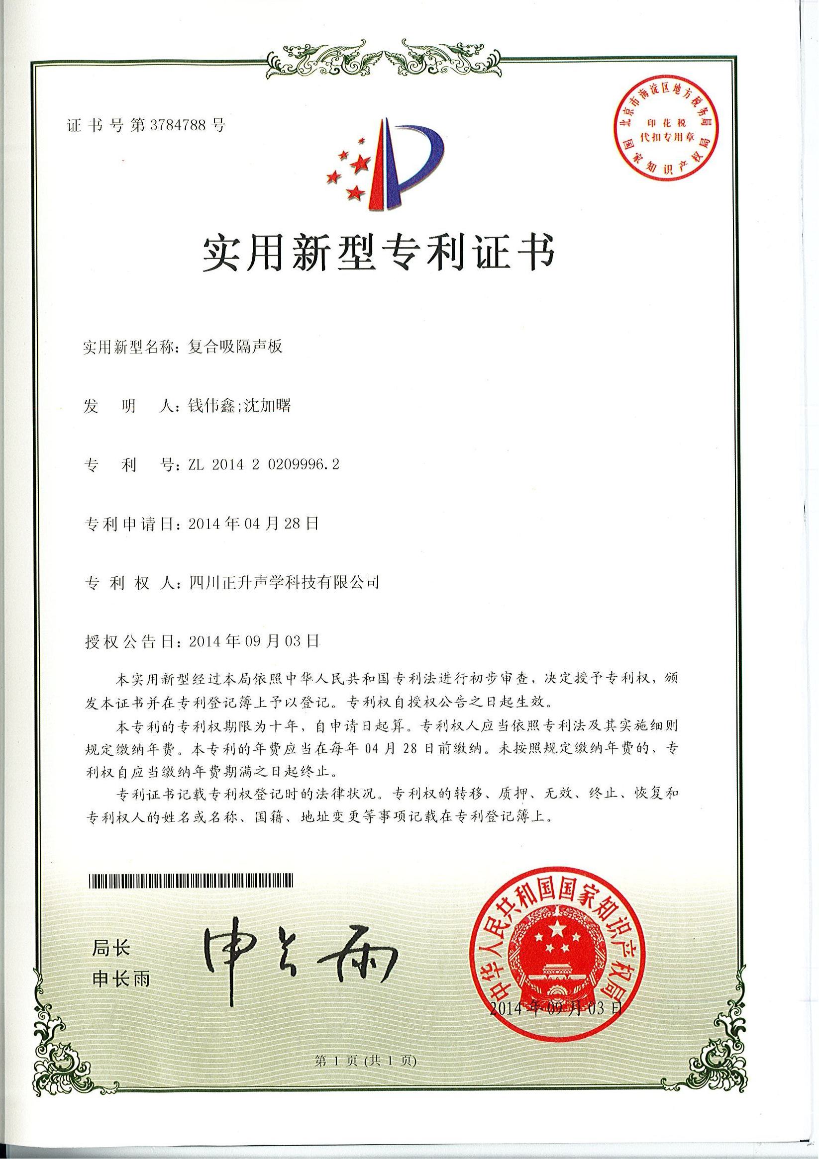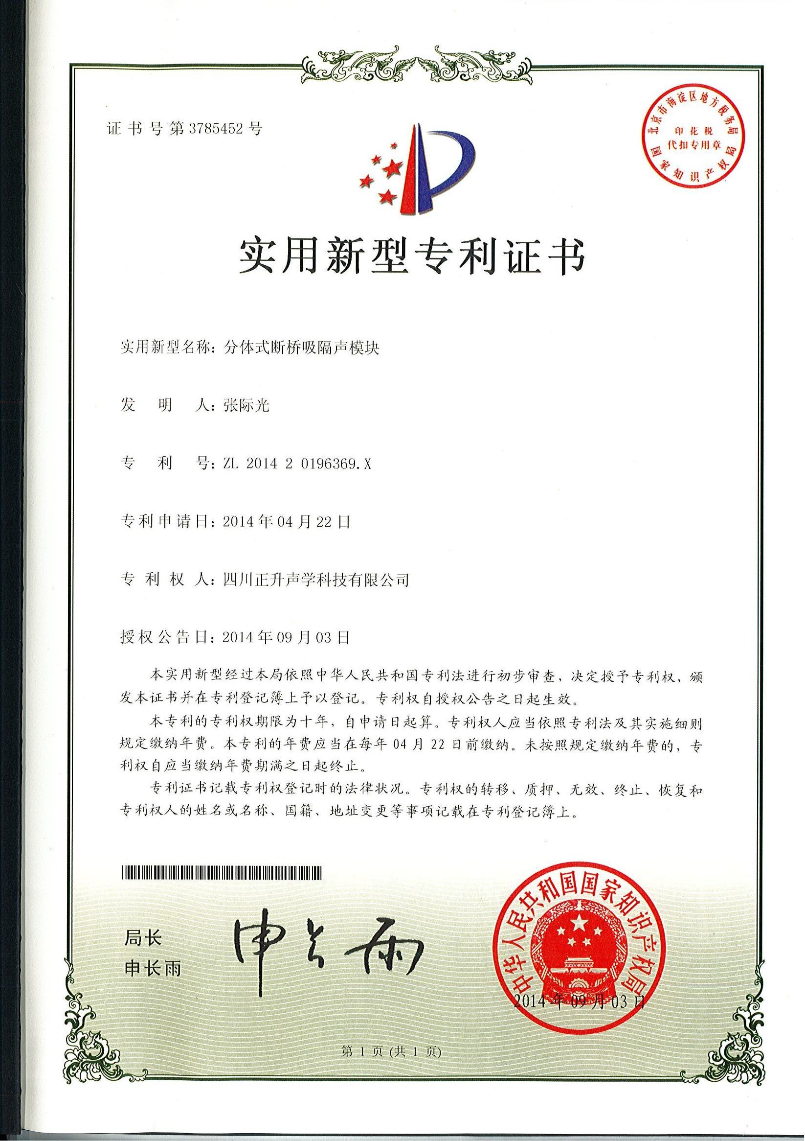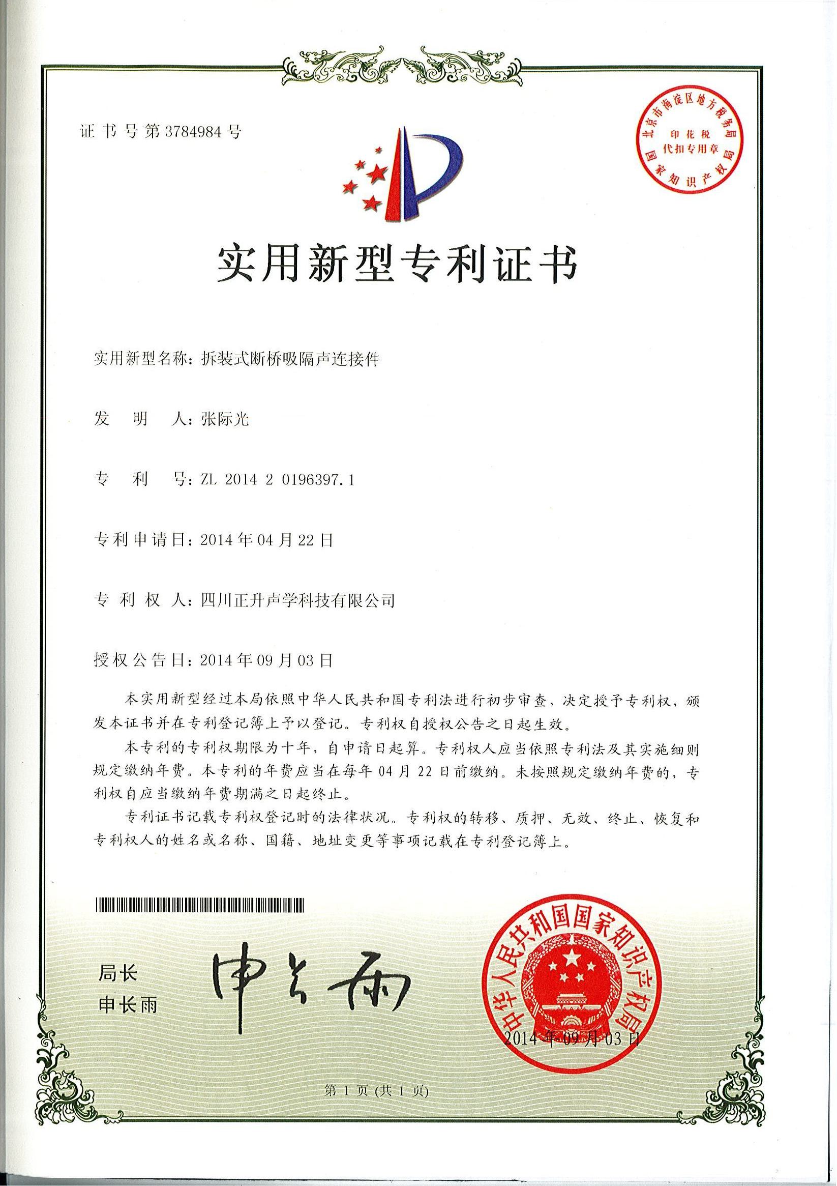 热烈祝贺公司拆装式断桥吸隔声连接件、分体式断桥吸隔声模块、复合吸隔声板、可变通道阻性消声器等实用新型专利授权且颁发证书。