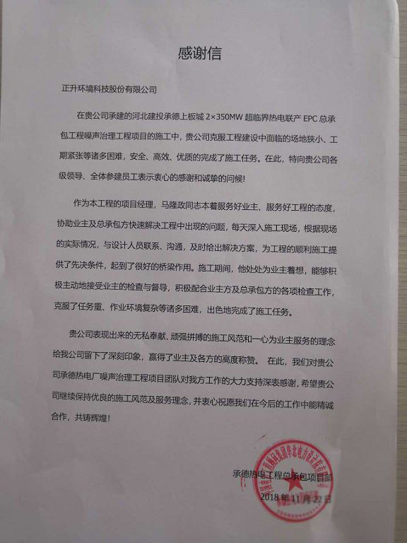 2018年11月22日,公司收到华北电力设计院承德热电工程总承包项目部发来的感谢信。我公司承建的河北建投承德上板城2×350MW超临界热电联产EPC总承包工程降噪治理工程项目,获得华北电力设计院赞许。