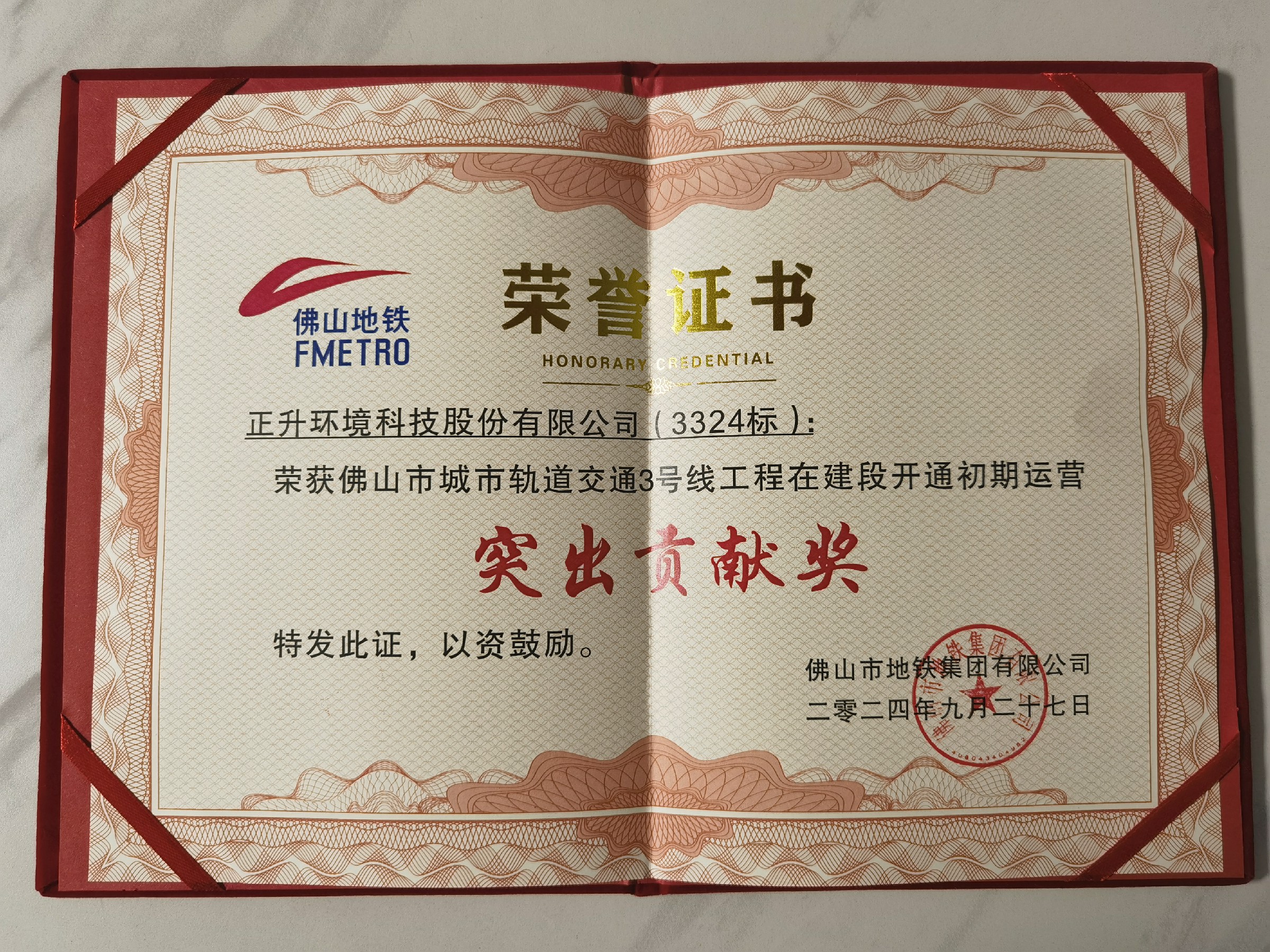 喜讯|佛山市城市轨道交通3号线工程消声器设备采购项目荣获“突出贡献奖”
