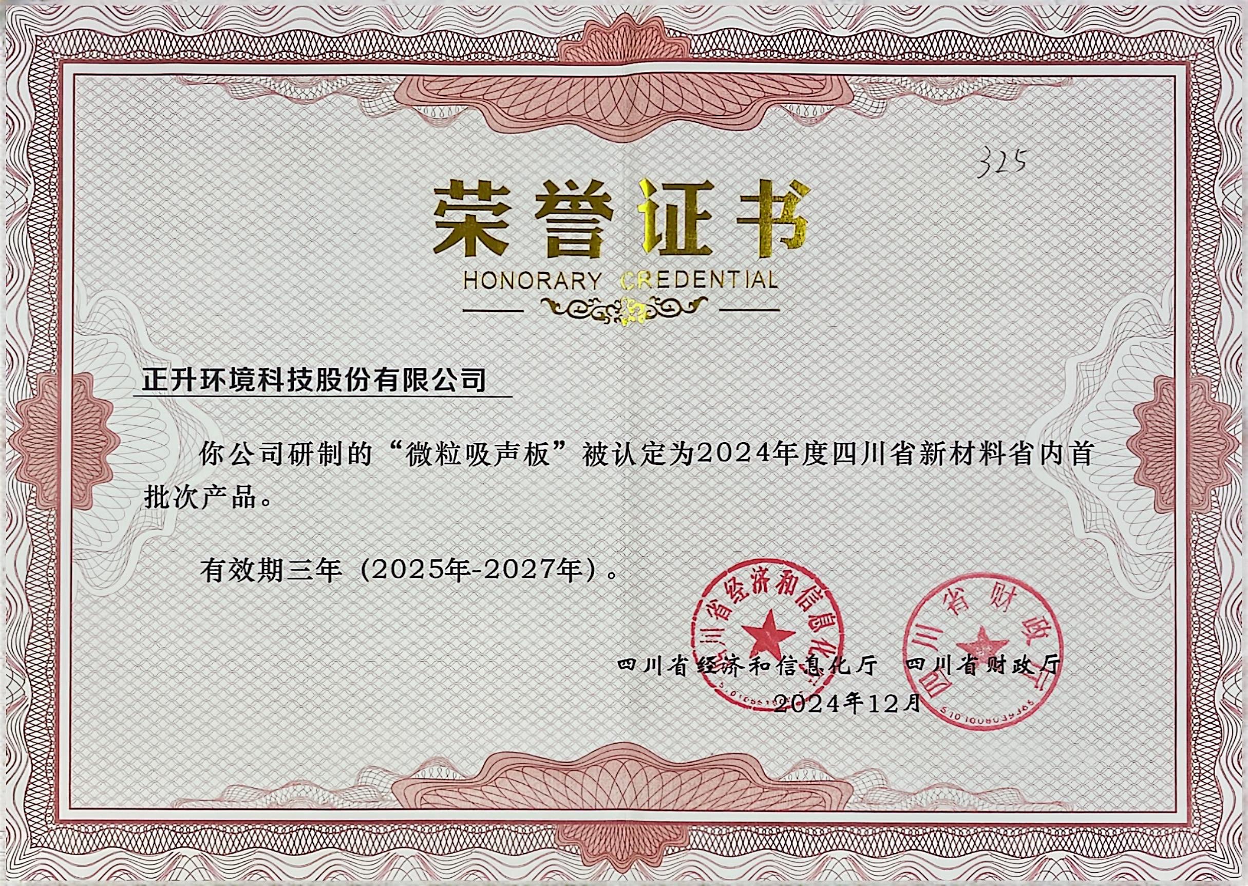 正升环境“微粒吸声板”产品通过四川省新材料首批次认定!